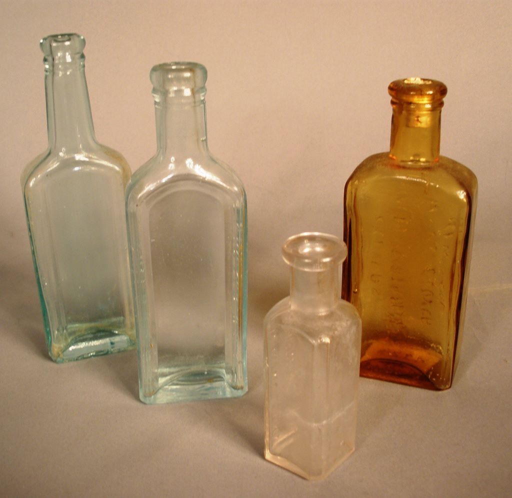 Medicine Bottles, group of 5: 1) Dr. L.A. Clark, Cambridge, NY (clear but cloudy glass), 1" x 3 1/2"; 2) Foley & Co., Chicago, USA (light blue glass); 3) Chas. H. Fletcher's Castoria (light blue glass), Reads "365" on the bottom, 6" x 2"; 4) Glover's Imperial Distemper Remedy, H. Clay Glover, New York (gold color with cork), Reads "412" on bottom), 5 1/4" x 2"; 5) Ayer's Sarsaparilla Compound Ext, Lowell, Mass., USA (beautiful clear, light blue), 5 1/2" x 2" Medicine Bottles, group of 5: 1) Dr. L.A. Clark, Cambridge, NY (clear but cloudy glass), 1" x 3 1/2"; 2) Foley & Co., Chicago, USA (light blue glass); 3) Chas. H. Fletcher's Castoria (light blue glass), Reads "365" on the bottom, 6" x 2"; 4) Glover's Imperial Distemper Remedy, H. Clay Glover, New York (gold color with cork), Reads "412" on bottom), 5 1/4" x 2"; 5) Ayer's Sarsaparilla Compound Ext, Lowell, Mass., USA (beautiful clear, light blue), 5 1/2" x 2"
