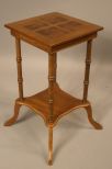Small Square Walnut Table w/four burl design squares in the top. Has two tiers supported by sausage turnings. 15" square, h. 28" Small Square Walnut Table w/four burl design squares in the top. Has two tiers supported by sausage turnings. 15" square, h. 28"
