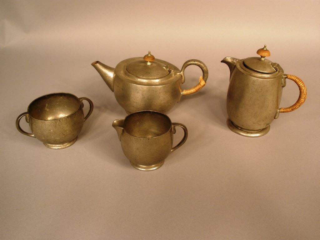 Pewter Ware: Great 4 piece set of pewter by the renowned Liberty & Co. of London, c1901-1914. Set consists of coffee pot, 7", tea pot, 3 1/2", cream and sugar, 3" Pewter Ware: Great 4 piece set of pewter by the renowned Liberty & Co. of London, c1901-1914. Set consists of coffee pot, 7", tea pot, 3 1/2", cream and sugar, 3"