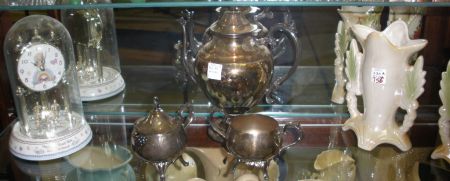 732 Collection of Precious Moment Clock, 3 Piece Silver Tea Set, and pair of vases made in Brazil