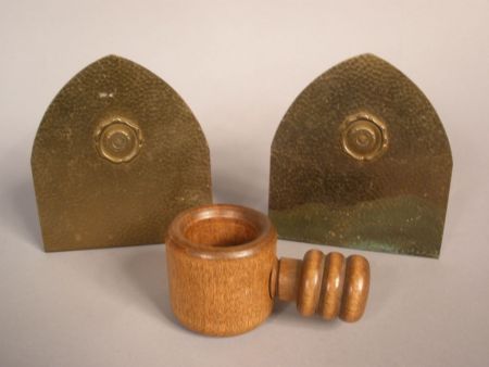 c1910-1920 Arts and Crafts Hammered Copper Bookends with original patination for Kansas State Agricultural College by C. Robbins Company, Attleboro, MA, 5 1/2"h; Wood Nutcracker. c1910-1920 Arts and Crafts Hammered Copper Bookends with original patination for Kansas State Agricultural College by C. Robbins Company, Attleboro, MA, 5 1/2"h; Wood Nutcracker.