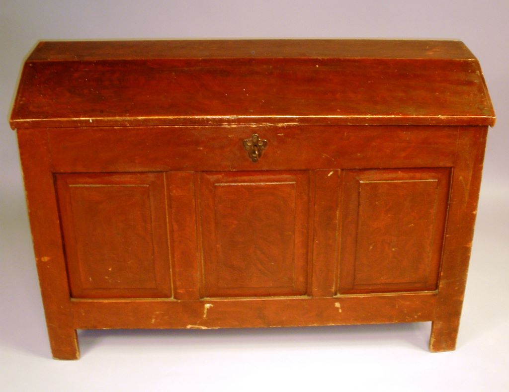 Wonderful old pine blanket chest. Chest is finished in rubbed mahogany with recessed panels along front and sides. w. 45 1/2", h. 32" Wonderful old pine blanket chest. Chest is finished in rubbed mahogany with recessed panels along front and sides. w. 45 1/2", h. 32"