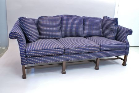 Pretty Camel Back Sofa in Blue Upholstered Fabric., 7 ft. W 34 1/2 H Pretty Camel Back Sofa in Blue Upholstered Fabric., 7 ft. W 34 1/2 H