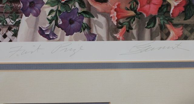 Limited Edition 502 of 950 "First Prize" print by Pati Bannister, Mississippi Gulf Coast Artist. Young girl on a porch holding basket of flowers. Framed and matted by Williams Gallery, Gulfport. 19" w., 23" h. Limited Edition 502 of 950 "First Prize" print by Pati Bannister, Mississippi Gulf Coast Artist. Young girl on a porch holding basket of flowers. Framed and matted by Williams Gallery, Gulfport. 19" w., 23" h.