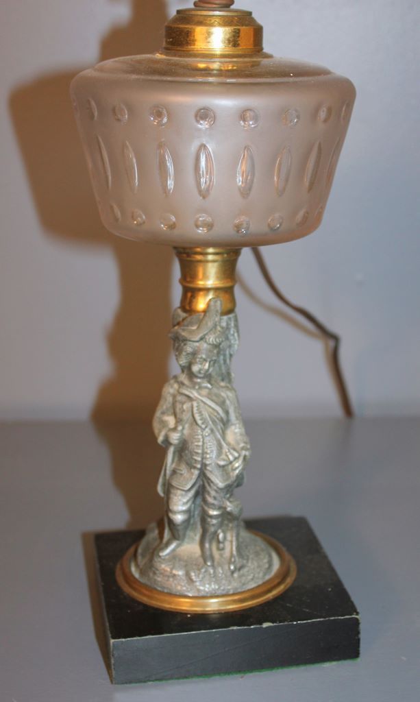 Mid 19th century lamp on Rosewood Stand, Spelter figure of young soldier, cut glass front, brass cap, now electrified. 21 1/2" h. Mid 19th century lamp on Rosewood Stand, Spelter figure of young soldier, cut glass front, brass cap, now electrified. 21 1/2" h.