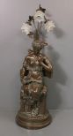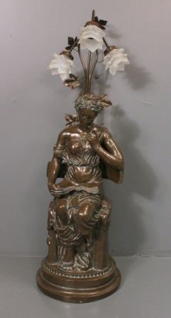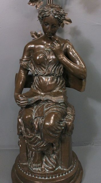Classical Figure of lady in a chair reading, resin made to look like bronze, now a lamp with three tulip shades. 46" h., base 14" dia. Classical Figure of lady in a chair reading, resin made to look like bronze, now a lamp with three tulip shades. 46" h., base 14" dia.