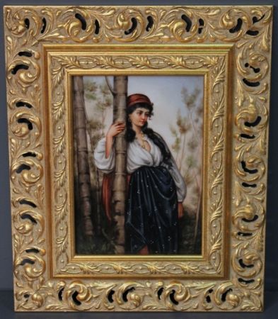 Beautiful Oil painting on porcelain of Gypsy standing the trees. In carved gold frame. 14 1/2" w., 17 1/2" h. Beautiful Oil painting on porcelain of Gypsy standing the trees. In carved gold frame. 14 1/2" w., 17 1/2" h.