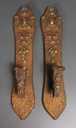 Pair of wood, paint decorated wall sconces. 3 1/2" w., 17" h. Pair of wood, paint decorated wall sconces. 3 1/2" w., 17" h.
