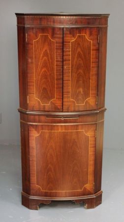 English 20th century mahogany corner cabinet. Top section has two doors with string inlay, center glass pull out drawer, lower section has same two doors and inlay, top detailed molding. 20" w., 17" d., 58" h. English 20th century mahogany corner cabinet. Top section has two doors with string inlay, center glass pull out drawer, lower section has same two doors and inlay, top detailed molding. 20" w., 17" d., 58" h.