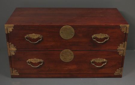 Henredon Acquisitions Collection mahogany Ming campaign chest, two drawers, all original brasses, L. 39", W. 39", D. 18" Henredon Acquisitions Collection mahogany Ming campaign chest, two drawers, all original brasses, L. 39", W. 39", D. 18"
