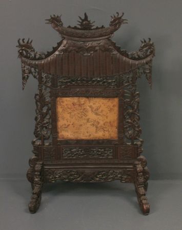 19th century Chinese table screen elaborately carved elm wood with dragons and lotus blooms. Centerpiece of tapestry framed in by carving of dragons and flowers, 31 1/2"h x 21"w. 19th century Chinese table screen elaborately carved elm wood with dragons and lotus blooms. Centerpiece of tapestry framed in by carving of dragons and flowers, 31 1/2"h x 21"w.