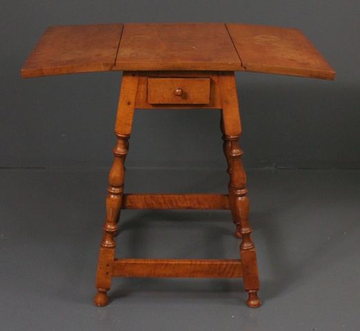 Early 19th Century Maple Drop Leaf Table. Rare tiger maple drop leaf table with one drawer. Top 11" w., 19 1/2" d., 25 1/2" h., each leave 8 1/2" w. Early 19th Century Maple Drop Leaf Table. Rare tiger maple drop leaf table with one drawer. Top 11" w., 19 1/2" d., 25 1/2" h., each leave 8 1/2" w.
