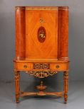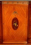 Satin wood hand-painted cabinet, single door with two shelf interior hand painted, beading, single center drawer, hand carved decoration, legs carved into center stretcher which is an urn. Label - Irwin. 36 1/2" w., 17" d., 65" h. Satin wood hand-painted cabinet, single door with two shelf interior hand painted, beading, single center drawer, hand carved decoration, legs carved into center stretcher which is an urn. Label - Irwin. 36 1/2" w., 17" d., 65" h.