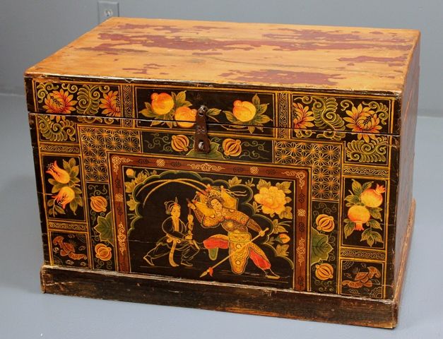 Chinosorie Storage Trunk c1900. Wear on the black paint, coffee table size. 31 1/2" w., 21" d., 21 1/2" h. Chinosorie Storage Trunk c1900. Wear on the black paint, coffee table size. 31 1/2" w., 21" d., 21 1/2" h.
