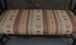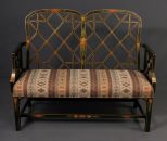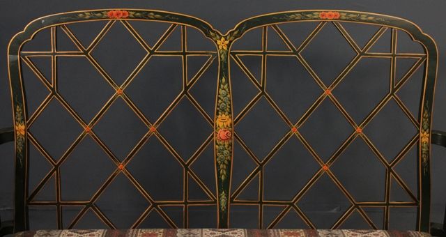 Hand Painted Settee, decorative dark green settee with lattice design back, hand painted flowers. 47 1/2" w., 19" d., 37 1/2" h. Hand Painted Settee, decorative dark green settee with lattice design back, hand painted flowers. 47 1/2" w., 19" d., 37 1/2" h.