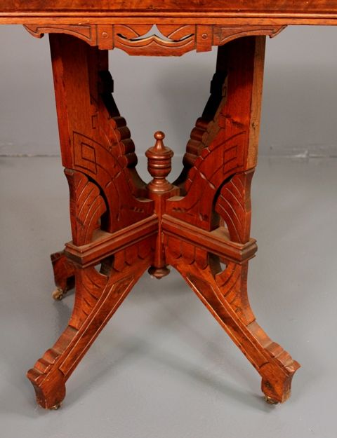 Walnut Eastlake table with brown marble top, carved apron, burl walnut, original brass caster. 30" w., 22" d., 30" h. Walnut Eastlake table with brown marble top, carved apron, burl walnut, original brass caster. 30" w., 22" d., 30" h.