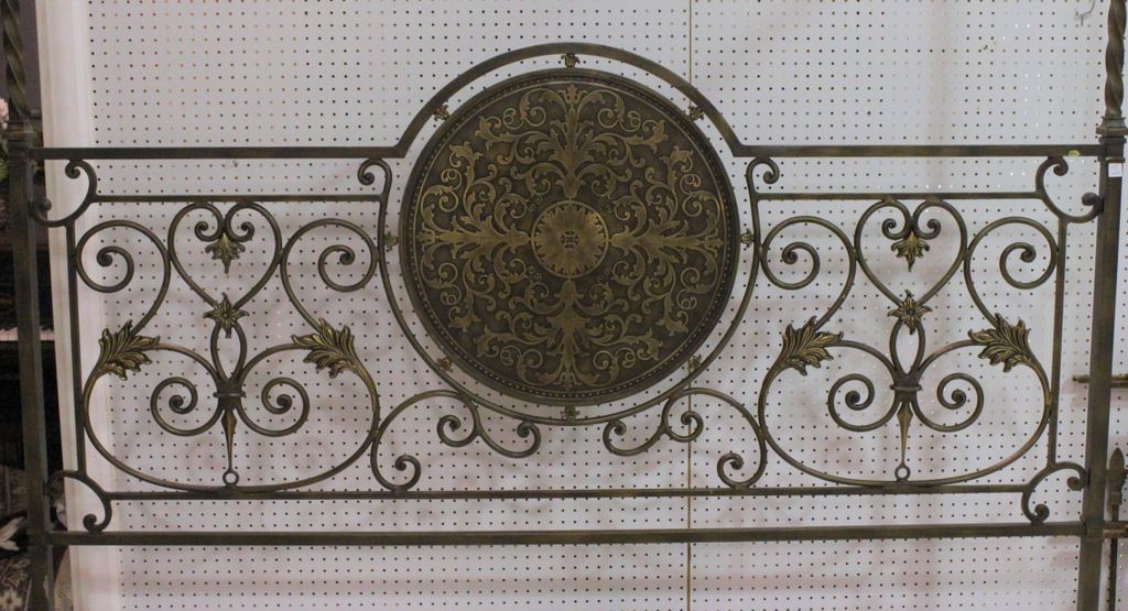 Contemporary King Size Iron Teaster Bed. Fancy headboard with medallion which has brass inlay. 84" h., 75" l., 80" w. Contemporary King Size Iron Teaster Bed. Fancy headboard with medallion which has brass inlay. 84" h., 75" l., 80" w.
