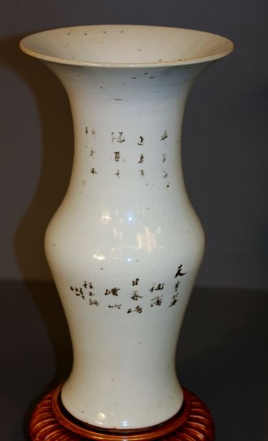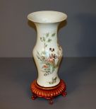 White Porcelain Chinese Trumpet Vase, hand-painted with maidens in garden with stand. 14 1/2" h., 7 1/2" dia. White Porcelain Chinese Trumpet Vase, hand-painted with maidens in garden with stand. 14 1/2" h., 7 1/2" dia.