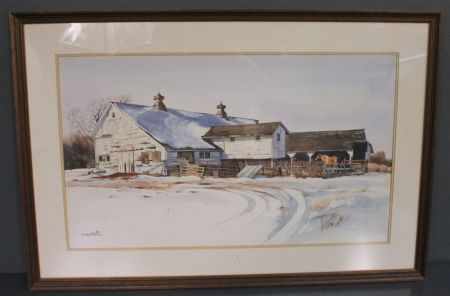 "Chardon Farms" Watercolor, scene of horse barn at "Chardon Farms" Illinois artist signed lower left Al Stine. 36 1/2" w., 24 1/2" h. "Chardon Farms" Watercolor, scene of horse barn at "Chardon Farms" Illinois artist signed lower left Al Stine. 36 1/2" w., 24 1/2" h.