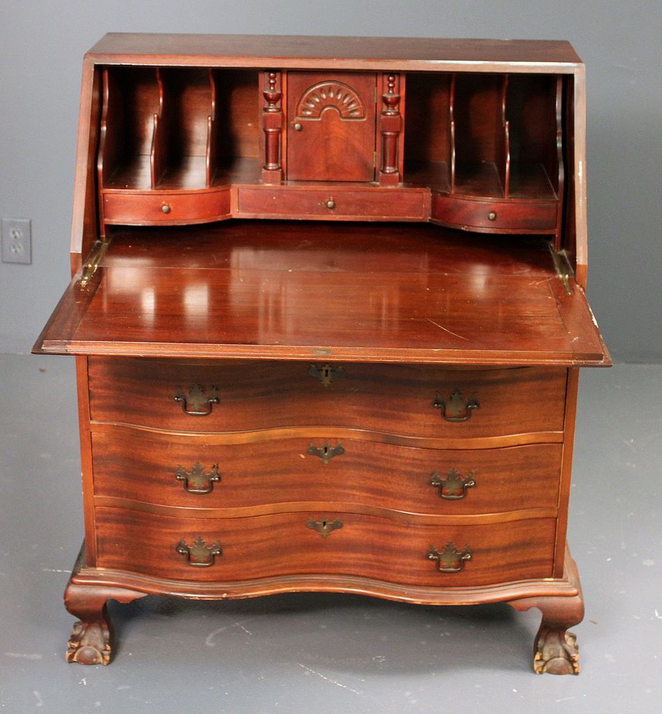 20th Century Mahogany Chippendale Style Fall Front Desk with D.H. Holmes (New Orleans, LA) paper label on back. Four drawers under fall front which has divided sections, ball and claw feet. 32 1/2" w., 16" d., 41 1/2" h. 20th Century Mahogany Chippendale Style Fall Front Desk with D.H. Holmes (New Orleans, LA) paper label on back. Four drawers under fall front which has divided sections, ball and claw feet. 32 1/2" w., 16" d., 41 1/2" h.