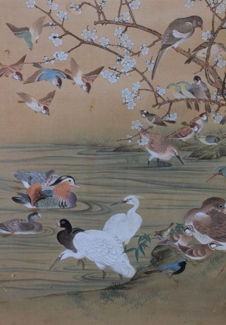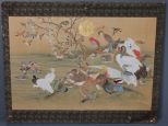 Large Cjinese Silk Painting of favored birds. Artist was versed in all birds and characteristics; rare Asian 1970. Has brocade border - some tearing at various areas, needs backing 55 1/2" w., 44 1/2" h. Large Cjinese Silk Painting of favored birds. Artist was versed in all birds and characteristics; rare Asian 1970. Has brocade border - some tearing at various areas, needs backing 55 1/2" w., 44 1/2" h.