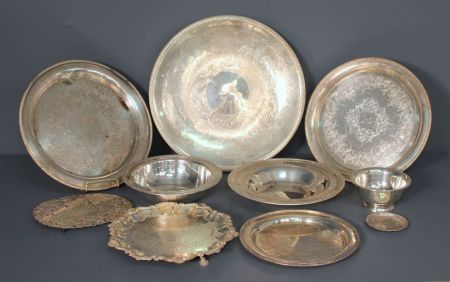Group of Twelve Silverplate Pieces; three round trays (14 1/4", 15", 17 3/8") footed 11 3/4" tray, 11" round tray, oval trivet that extends (10 1/2") bowl (10 1/4") reticulated bowl (12" dia.) change tray (4" dia.) bowl (6" dia.) Group of Twelve Silverplate Pieces; three round trays (14 1/4", 15", 17 3/8") footed 11 3/4" tray, 11" round tray, oval trivet that extends (10 1/2") bowl (10 1/4") reticulated bowl (12" dia.) change tray (4" dia.) bowl (6" dia.)