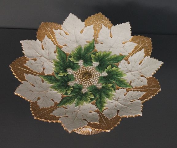 Meissen Porcelain Compote, rare crossed swords leaf design. Mark is 1850-99 Bright gold gilt, raised white and green leaves. 6 1/2" h., 11 1/4" w. Meissen Porcelain Compote, rare crossed swords leaf design. Mark is 1850-99 Bright gold gilt, raised white and green leaves. 6 1/2" h., 11 1/4" w.