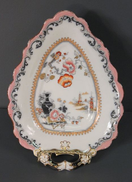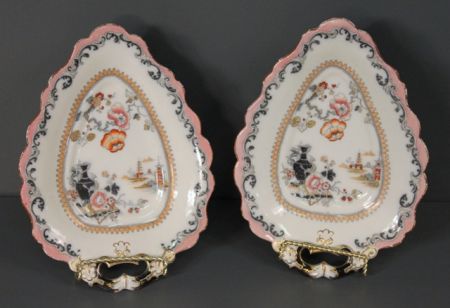Two Ironstone Bon-Bons; ironstone china, H. Meakin, English 1873-1876. Scallop edge, hand-painted oriental scenes. 11" l., 8" w. Two Ironstone Bon-Bons; ironstone china, H. Meakin, English 1873-1876. Scallop edge, hand-painted oriental scenes. 11" l., 8" w.