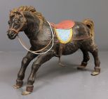 20th Century Cast Iron Carousel Horse; beautifully painted black with brown highlights, painted tri-color saddle, leather reins, iron stirrups. Two legs welded at top. 41" w., 29" h., 10" d. 20th Century Cast Iron Carousel Horse; beautifully painted black with brown highlights, painted tri-color saddle, leather reins, iron stirrups. Two legs welded at top. 41" w., 29" h., 10" d.