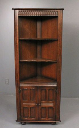 Contemporary Oak Corner Cabinet; with three scallop shelves, two raised panel doors at bottom. 26 1/2" w., 13 1/2" d., 65 1/2" h. Contemporary Oak Corner Cabinet; with three scallop shelves, two raised panel doors at bottom. 26 1/2" w., 13 1/2" d., 65 1/2" h.