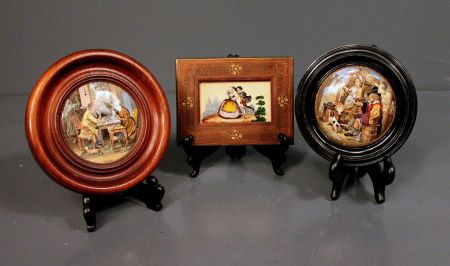 Three Hand-Painted Pictures; pair of hand-painted on porcelain scenes, one is of awoman and a man (6" dia.) one of couple playing cards (6 1/2" dia.) one reverse oil of young couple, in brass inlay frame (6 1/4" w., 4 5/8" h.) Three Hand-Painted Pictures; pair of hand-painted on porcelain scenes, one is of awoman and a man (6" dia.) one of couple playing cards (6 1/2" dia.) one reverse oil of young couple, in brass inlay frame (6 1/4" w., 4 5/8" h.)