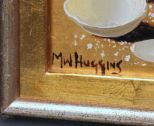 20th Century Oil Painting of Shells; oil on board, white shells painted on gold board. Signed lower left M. W. Huggins. 22" w., 14 1/2" h. 20th Century Oil Painting of Shells; oil on board, white shells painted on gold board. Signed lower left M. W. Huggins. 22" w., 14 1/2" h.