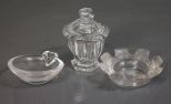 Three Pieces of Art Glass; signed Lalique frosted dish with eight children's faces around the rim ( 1 1/2" h., 4 1/4" dia.) signed Baccarat, France mustard jar (4 1/2" h., 3 1/4" dia.) signed Stuben glass ashtray 4" dia. Three Pieces of Art Glass; signed Lalique frosted dish with eight children's faces around the rim ( 1 1/2" h., 4 1/4" dia.) signed Baccarat, France mustard jar (4 1/2" h., 3 1/4" dia.) signed Stuben glass ashtray 4" dia.