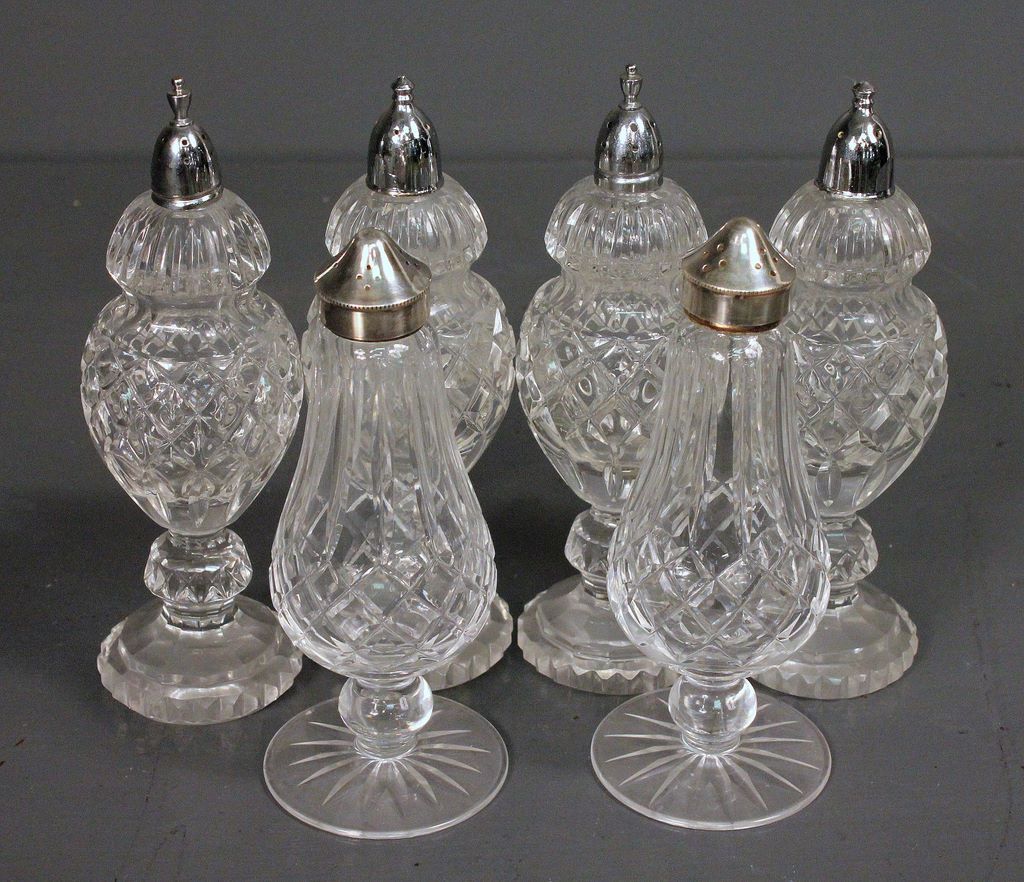 Three Pair of Cut Glass Salt and Pepper Shakers, four different sections of cut glass - no damage, Silverplate lids. 7 1/4"h.; 7 1/2" h., 2" dia.; 6 1/2" h, 2 1/2" dia. Three Pair of Cut Glass Salt and Pepper Shakers, four different sections of cut glass - no damage, Silverplate lids. 7 1/4"h.; 7 1/2" h., 2" dia.; 6 1/2" h, 2 1/2" dia.