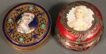Two 20th Century French Limoge Pill Boxes, red enamel, portrait of lady, signed Bert (1 1/2" dia.); brass with cobalt enamel. 2 1/2" dia. Two 20th Century French Limoge Pill Boxes, red enamel, portrait of lady, signed Bert (1 1/2" dia.); brass with cobalt enamel. 2 1/2" dia.
