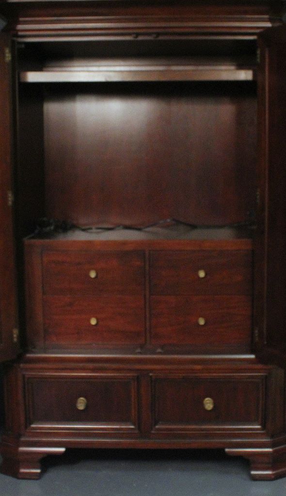 Martha Stewart Signature Wardrobe/Entertainment Center; Mahogany empire style with two doors, interior fitted with four drawers, two shelves. Base has two large doors all supported by bracket feet; 53" w., 23 1/2" d., 86" h. Martha Stewart Signature Wardrobe/Entertainment Center; Mahogany empire style with two doors, interior fitted with four drawers, two shelves. Base has two large doors all supported by bracket feet; 53" w., 23 1/2" d., 86" h.