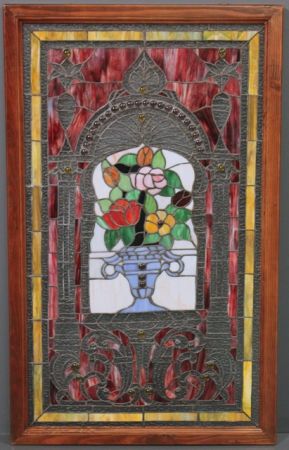 Stain Glass Window in Wooden Frame, vibrant colors, basket of flowers in wood frame. 22" w., 36" h. Stain Glass Window in Wooden Frame, vibrant colors, basket of flowers in wood frame. 22" w., 36" h.