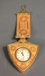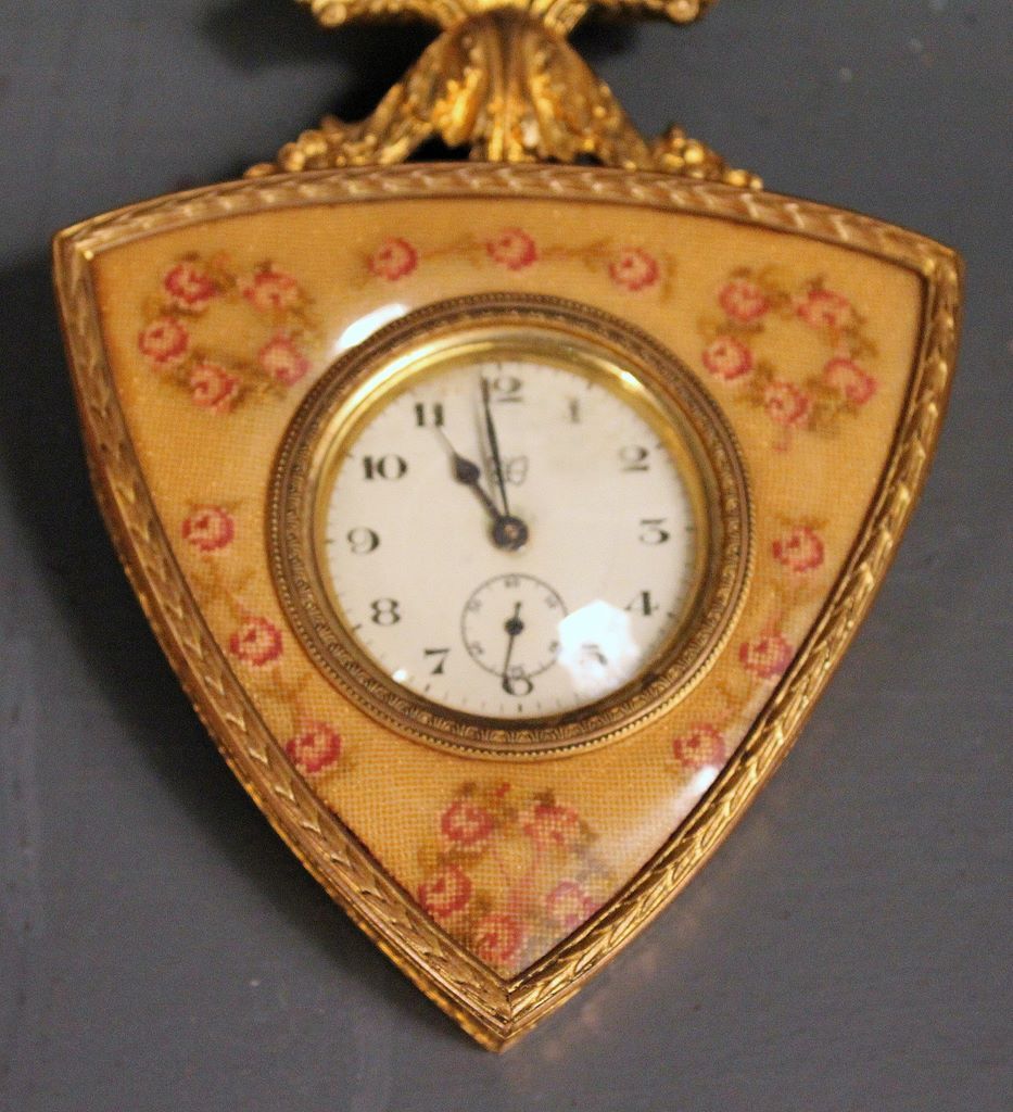 Made in Austria Triangular Shape Clock; triangular shape brass frame, petit point surrounding face of clock, attached to bell pull form needlepoint; 11" h., 4" w. Made in Austria Triangular Shape Clock; triangular shape brass frame, petit point surrounding face of clock, attached to bell pull form needlepoint; 11" h., 4" w.