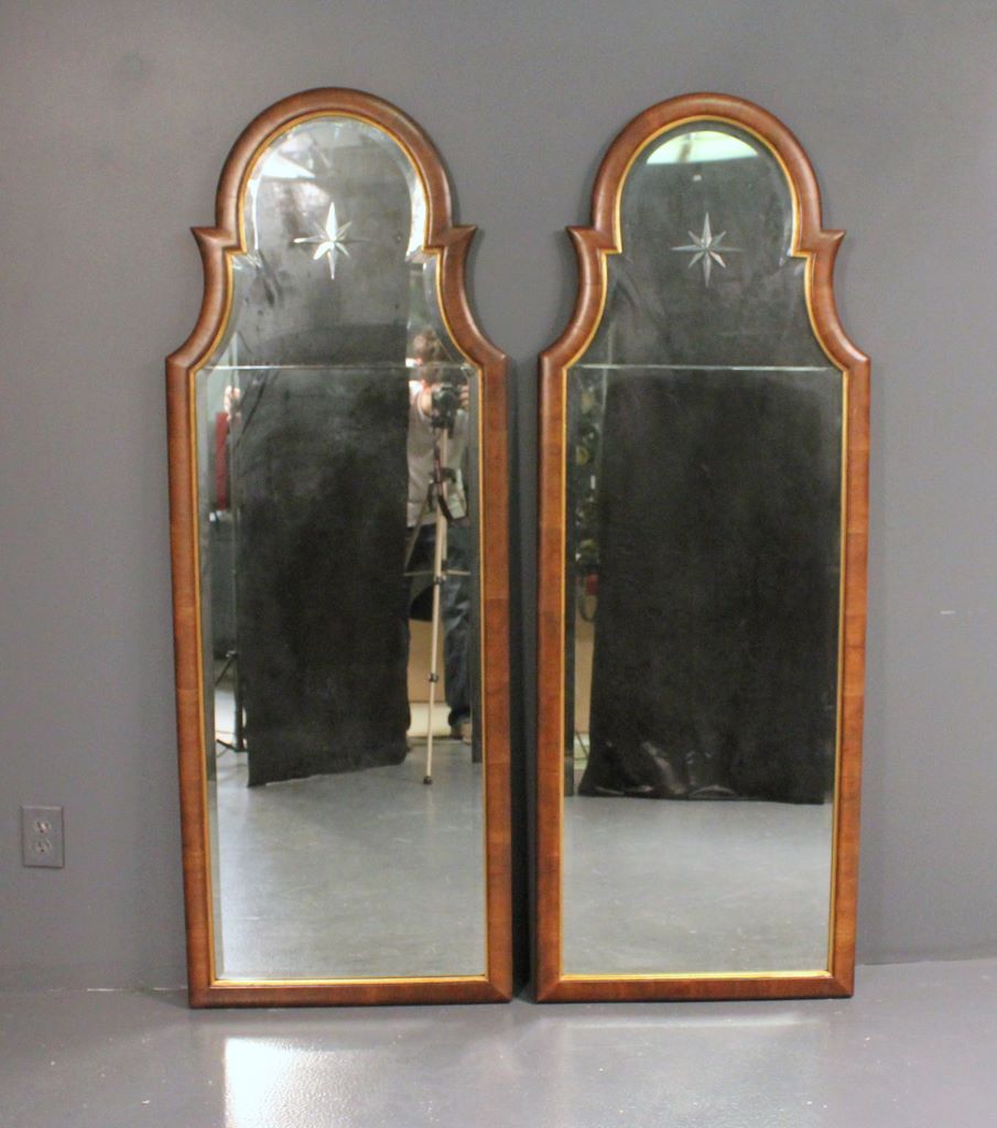 Pair of Contemporary Beveled Glass Mirrors; walnut frame, gold liner, beveled glass, two sectional mirrors; 24" w., 67 1/2" h. Pair of Contemporary Beveled Glass Mirrors; walnut frame, gold liner, beveled glass, two sectional mirrors; 24" w., 67 1/2" h.