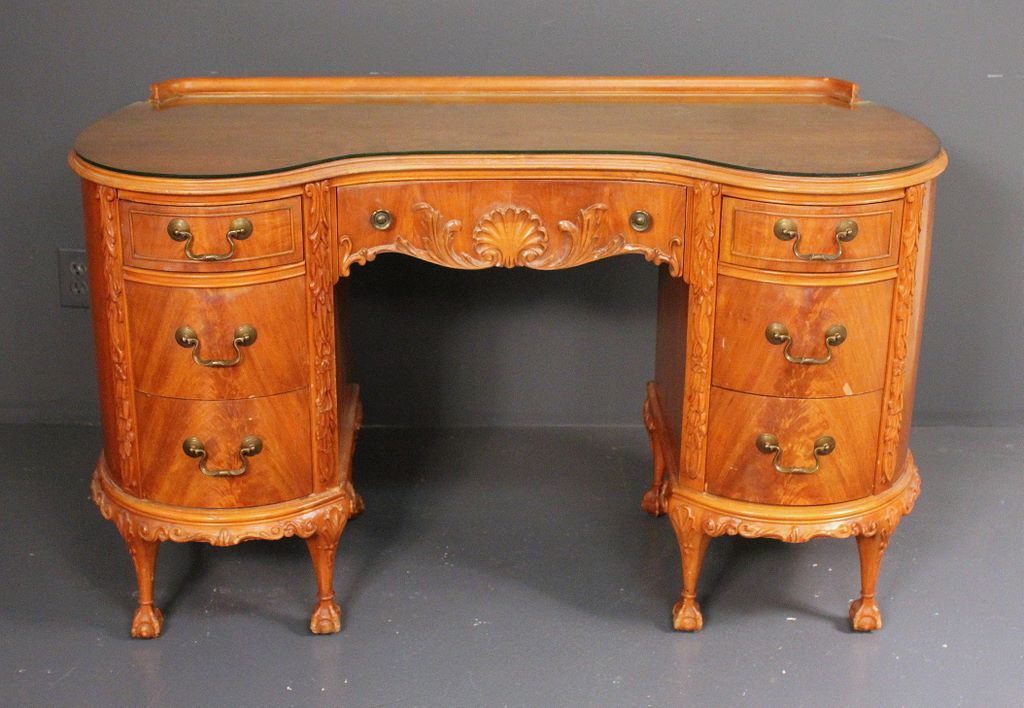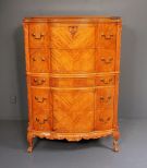1920's Eight Piece Chicago Bedroom Suite; Smyth and Company, Chicago, Illinois; suits consisting of bed (standard double 54" w., 46" h.); kidney shape vanity with glass top (50 1/2" w., 20" d., 31 1/2" h.); vanity stool (26 1/2" w., 15" d., 22" h.); chest of drawers, three drawers (49 1/2" w., 24" d., 35 1/2" h.) chest on chest, five drawers with small gallery (37" w., 22" d., 56 1/2" h.) ; bedside stand with small gallery, two drawers (18" w., 14" d., 30 1/2" h.); two wall mirrors with hand carving (47" h., 27" w.) 1920's Eight Piece Chicago Bedroom Suite; Smyth and Company, Chicago, Illinois; suits consisting of bed (standard double 54" w., 46" h.); kidney shape vanity with glass top (50 1/2" w., 20" d., 31 1/2" h.); vanity stool (26 1/2" w., 15" d., 22" h.); chest of drawers, three drawers (49 1/2" w., 24" d., 35 1/2" h.) chest on chest, five drawers with small gallery (37" w., 22" d., 56 1/2" h.) ; bedside stand with small gallery, two drawers (18" w., 14" d., 30 1/2" h.); two wall mirrors with hand carving (47" h., 27" w.)