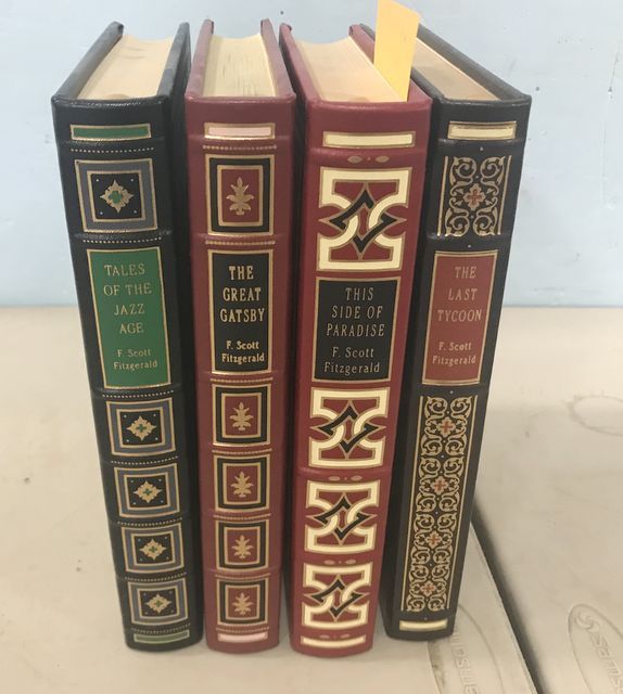 F. Scott Fitzgerald Books, gold bound, red, blue, mint condition, This sides of Paradise, The Great Gatsby, The Last Tycoon, Tales of the Jazz Age. F. Scott Fitzgerald Books, gold bound, red, blue, mint condition, This sides of Paradise, The Great Gatsby, The Last Tycoon, Tales of the Jazz Age.
