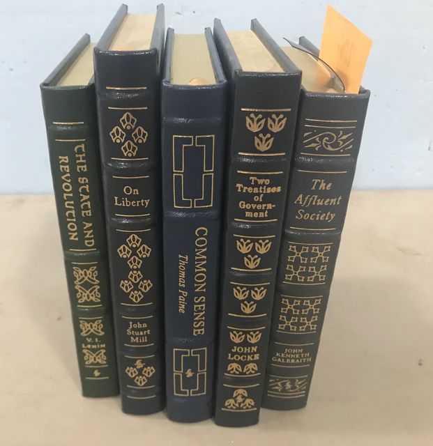 Five Gold Bound Books, mint condition, The State and Revolution, Two Treatises of Government by John Locke, Common Sense by Thomas Paine, On Liberty by John Stuart Mill, The Affluent Society by John Galbraith. Five Gold Bound Books, mint condition, The State and Revolution, Two Treatises of Government by John Locke, Common Sense by Thomas Paine, On Liberty by John Stuart Mill, The Affluent Society by John Galbraith.
