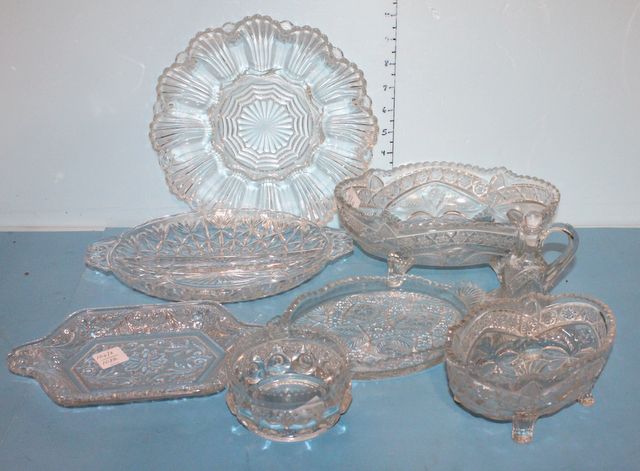 8 Pieces of Clear Press Glass Fruit bowl, cruet, egg tray, 3 small trays, 2 small dishes 8 Pieces of Clear Press Glass Fruit bowl, cruet, egg tray, 3 small trays, 2 small dishes