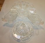107 4 Pieces of Clear Press Glass Butter dish, creamer and sugar, fan basket.