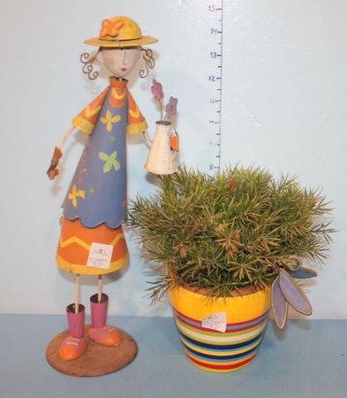 Painted Tin Girl with Flowers and Ceramic Flower Pot Painted Tin Girl with Flowers and Ceramic Flower Pot 5"h. Painted Tin Girl with Flowers and Ceramic Flower Pot Painted Tin Girl with Flowers and Ceramic Flower Pot 5"h.