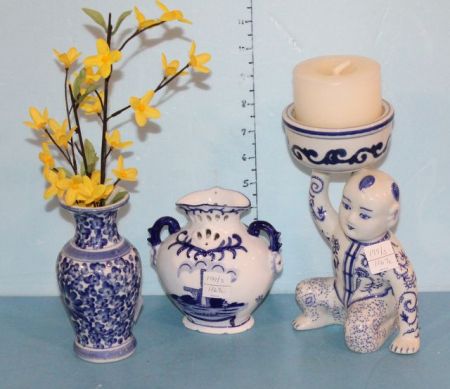 3 Pieces Blue and White Porcelain Oriental bag candle stand, 2 small vases, 5". 3 Pieces Blue and White Porcelain Oriental bag candle stand, 2 small vases, 5".