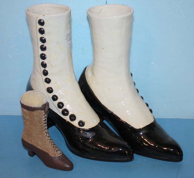 Pair of Black and White Ceramic Shoe Vase, Small Shoe Pin Cushion Pair of Black and White Ceramic Shoe Vase 9"h., Small Shoe Pin Cushion 4"h. Pair of Black and White Ceramic Shoe Vase, Small Shoe Pin Cushion Pair of Black and White Ceramic Shoe Vase 9"h., Small Shoe Pin Cushion 4"h.