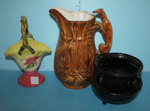 Three Pottery/Ceramic Pieces Ceramic Pitcher with hound head handle footed pot, hull basket with chip on base, 9"h. Three Pottery/Ceramic Pieces Ceramic Pitcher with hound head handle footed pot, hull basket with chip on base, 9"h.