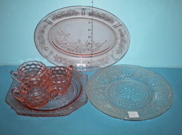 Pink Depression Glass Sugar, Creamer, cup, clear 10" plate, pink octogan shape plate 9", pink oval 12" platter. Pink Depression Glass Sugar, Creamer, cup, clear 10" plate, pink octogan shape plate 9", pink oval 12" platter.