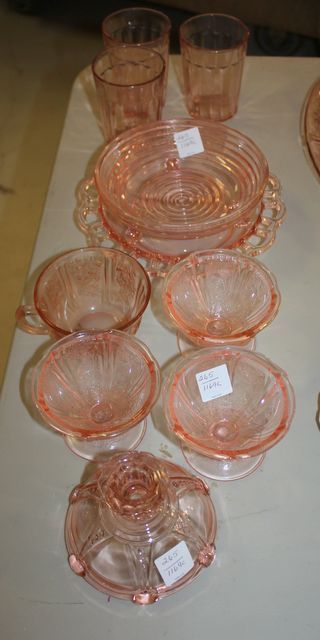 265 Pink Depression Glass Three sherbets, candlestick, three footed bowl 6" die, bowl, 8"dia., three tumblers.